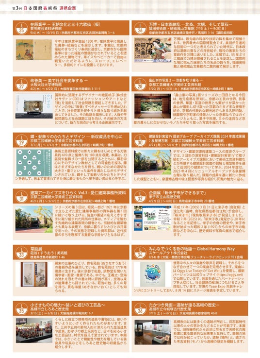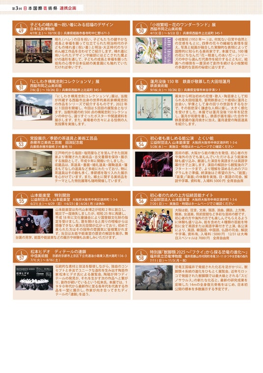 「日本国際芸術祭」のミッションである「アート・デザイン・サイエンス・テクノロジー・経済の共創」をまさに体現する連携事業に、第3回となる本年は関西のみならず全国の団体様より数多くのご参加をいただき、現在、全国の美術館・博物館など58企画が連携中です。