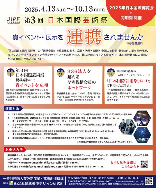 なお、「連携企画」は、2025年4月13日から10月13日までの「第3回日本国際芸術祭」の会期中、随時募集しております。同期間内に一日でも開催日が含まれるようでしたら、連携いただけます。