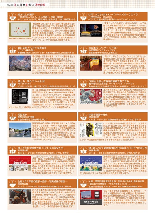 心を揺さぶるアート展はもちろん、知的好奇心を満たす展示、ここでしか味わえない音楽イベントや体験事業など、バラエティ豊かなイベントが盛り沢山!全国の各会場で皆様のご来場を心よりお待ちしております!