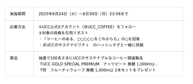 UCCジャパン株式会社は、サステナビリティ指針「2030年までに自社ブランドを100%サステナブルなコーヒー調達に」促進の一環として、コーヒー生産国における課題を生活者のみなさまが自分事として捉え、考えていただく新たなコミュニケーションを始動します。それに伴い、サステナブルなコーヒー調達製品が抽選で100名さまにあたる消費者キャンペーン「サステナブルなコーヒー調達 NewメッセージXキャンペーン」を6月24日(火)から実施します。