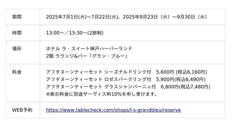 ホテル ラ・スイート神戸ハーバーランド(総支配人:檜山 和司 所在地:神戸市中央区)では、2025年7月1日から7月22日、9月23日から9月30日にラウンジ&バー グラン・ブルーで「LA SUITE Peach Afternoon Tea」の提供を開始いたします。