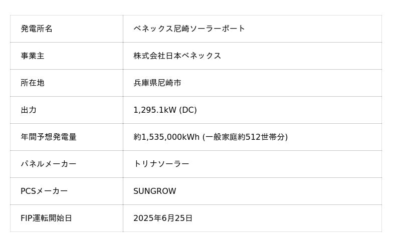 株式会社日本ベネックス(本社:長崎県諫早市、代表取締役社長:小林洋平、以下:日本ベネックス)は、兵庫県尼崎市にて三井不動産株式会社(本社:東京都中央区、代表取締役社長:植田俊、以下「三井不動産」)が開発した物流施設「三井不動産ロジスティクスパーク(MFLP)尼崎I」(以下、「MFLP尼崎I」)の屋根に約1.3MWの太陽光発電所「ベネックス尼崎ソーラーポート」(以下、「本発電所」)を設置し、このたび運転を開始いたしました。