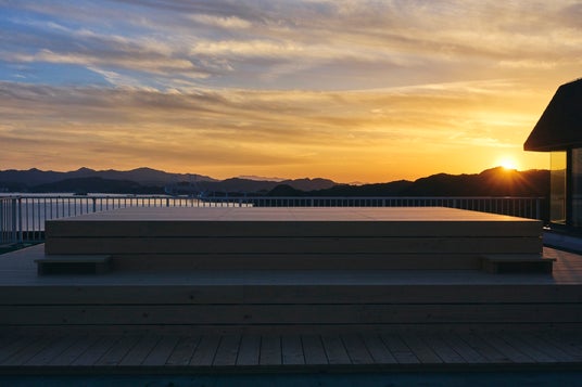 「KOHAKUテラス」から眺める、穏やかな海に光の道を作りながらゆっくりと沈む大きな夕陽