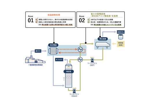 ごみ処理施設やバイオマス発電施設などの燃焼排ガスは、ガス量が多い一方でCO2濃度が低いことが特徴です。このような排ガスからCO2を高純度で回収するためには、吸収液を用いた化学反応により低温でCO2を吸収し、その後加熱することで放散・回収する「化学吸収法」という手法が適していますが、加熱の際に多大な熱エネルギーを必要とすることから、プロセスの省エネルギー化が課題とされています。