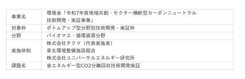 株式会社タクマ(本社:兵庫県尼崎市、社長:濱田州朗)、泉北環境整備施設組合(大阪府泉大津市、和泉市、高石市の3市から構成)、株式会社ユニバーサルエネルギー研究所(本社:東京都港区、社長:金田武司)の3者にて実施する「省エネルギー型CO2分離回収技術開発実証」(以下「本実証」)が、このほど、環境省が公募する「令和7年度地域共創・セクター横断型カーボンニュートラル技術開発・実証事業」に採択されました※1。本実証では、泉北環境整備施設組合のごみ処理施設「泉北クリーンセンター」(所在:大阪府和泉市)において、施設から排出されるCO2を分離回収するパイロット試験を実施する予定です。