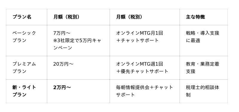 今回、より気軽に相談できる環境を求める声に応え、外部CAIOサービスに“月額2万円~のライトプラン”を追加。税理士的な立ち位置で、日常業務の中でのAI活用を支える仕組みを整えました。