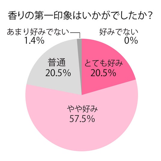 香水の香りを嗅いだ方に対する自社アンケートによると、73名の回答者中78.0%(57名)から好ましいと高評価、20.5%(15名)から普通、1.4%(1名)からあまり好みでないとの回答が得られました。