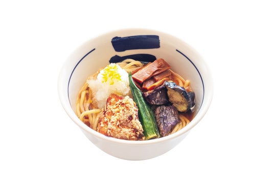 たっぷりの鬼おろし(粗削り大根)とオクラ、なすの夏野菜をふんだんに使用。三田製麺所の美味しい唐揚げものった、柚子香るさっぱりとした一杯です。