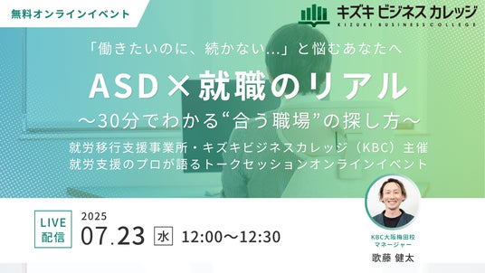 就労移行支援事業所・キズキビジネスカレッジ(KBC)は2025年7月23日(水)に、「ASDと就職」に悩む方へ向けた無料オンライントークイベントを開催します。