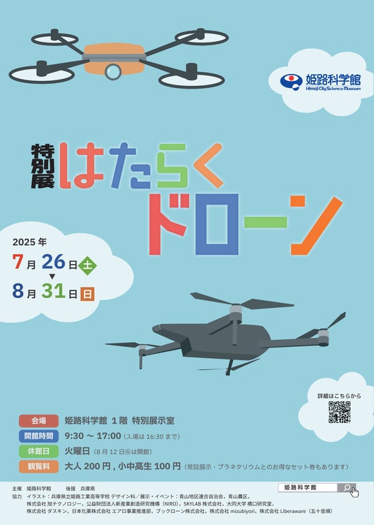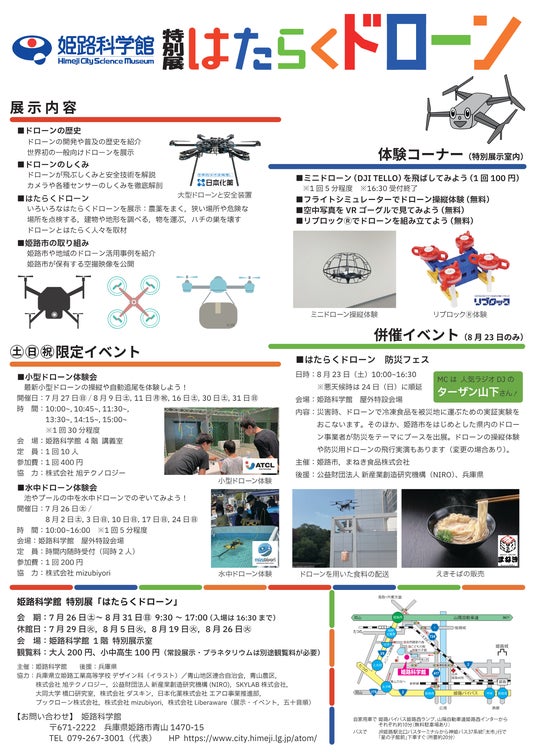 その名も《特別展 はたらくドローン@姫路科学館》。期間は、2025年7月26日(土)から8月31日(日)までの夏休みシーズン。
