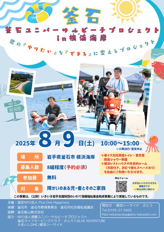 2011年東日本大震災の大津波被害から復興復旧が進み、海開きが実現した豊かな三陸、釜石市・根浜(ねばま)海岸の海で、ユニバーサルビーチ体験会を開催します。