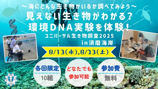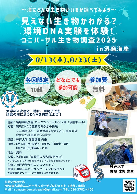 NPO法人須磨ユニバーサルビーチプロジェクト(須磨UBP)は、神戸大学佐賀研究室と協力し、須磨の海に漂うDNAを捕まえる環境DNA実験を8月13日(水)、8月23日(土)に須磨海岸にて実施します。昨年15組33名の方にご参加いただきました、この車いすでの環境DNA調査の取り組みは、障がいの有無に関係なく自然実験やアウトドアに参加できる環境を整えることで科学リテラシーの向上を図る※世界初 の取り組みとなりました。