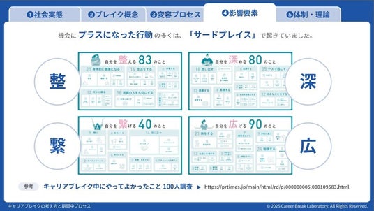 2024年に研究所が実施した「キャリアブレイク中にやってよかったこと100人調査」の結果、自分を整える、自分を深める、自分を繋げる、自分を広めるなど様々な行動は大まかに4つに分けられました。
