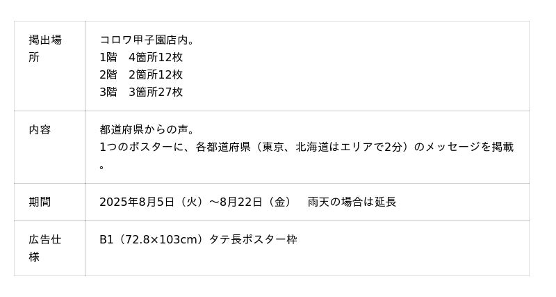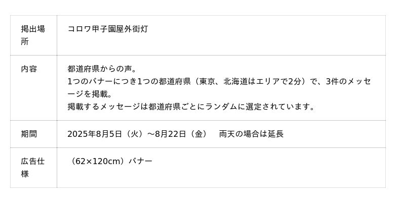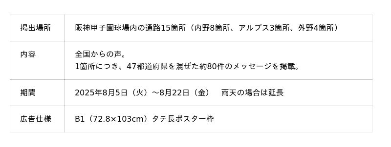 阪神甲子園球場内のポスターは球場内の15箇所に掲出され、ポスター1枚につき都道府県を混ぜた80件前後のメッセージが掲載されます。また、コロワ甲子園内では47都道府県(北海道と東京はエリアで2分)ごとに異なるポスターとなって掲載されます。屋外街灯バナーは、各都道府県(北海道と東京はエリアで2分)ごとにランダムな3件のメッセージを掲載しています。