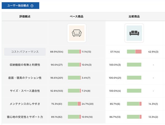 - AIによるセンチメント分類:観点抽出(品質、使い勝手、デザインなど)を自動生成しレビューセンテンスのネガポジ判定を実施。