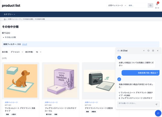 TrendViewerの分析データをベースにサイト訪問者へ対話型で商品提案を行うチャットボット機能です。