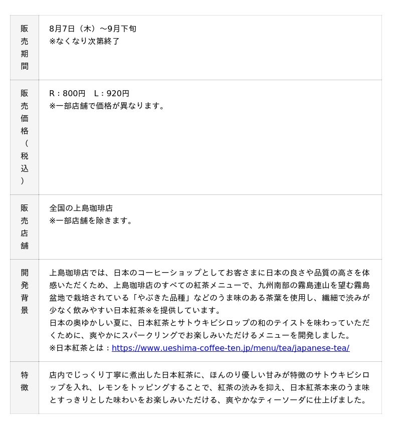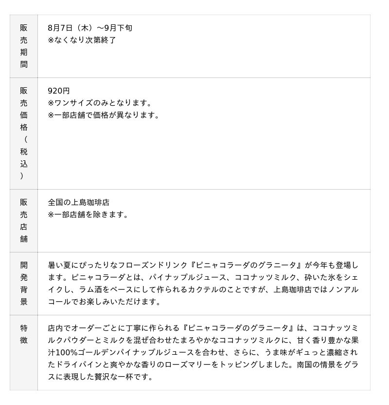 また、上島珈琲店こだわりの日本紅茶のうま味と柔らかな味わいを、スパークリングで楽しむ『日本紅茶のティーソーダ』、南国の情景を彷彿させるフローズンドリンク『ピニャコラーダのグラニータ』(ノンアルコール)を、同日より期間限定で発売します。