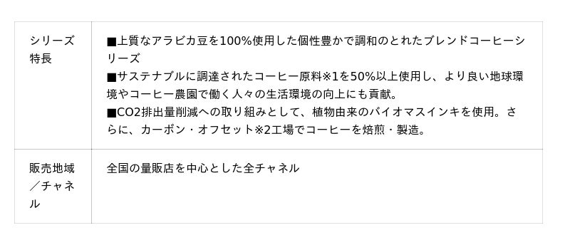 なお、本製品は森林資源を守りながら、未来のコーヒーの豊かさを守るために、地球環境への配慮として原料の一部にオーガニックコーヒーを使用しているほか、外装および個包装資材の一部に紙および植物由来のバイオマスインキを採用、カートンはFSC認証※を取得したものを使用しています。