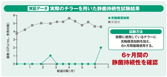 「VITA LUMINE CHILLER1」は本添加剤と分析サービスを組み合わせた「チラー冷却水の維持管理サービス」となります(図1)。チラー冷却水(水道水)に本添加剤を適量添加し、専用光源を当てて従来どおり使用いただくだけで、静菌効果が約6か月間持続します(図2)。