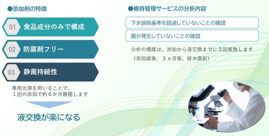 食品工場では、食品を適切な温度まで冷やして加工製造するために、チラー冷却水を循環使用しています。衛生管理上、チラー冷却水の腐敗を避ける必要がありますが、食品へのコンタミネーションリスクから、防腐剤を使用できないという課題があり、抜本的な解決策が長年存在していませんでした。この課題を解決するために開発したのが、食品成分で構成された「チラー用光触媒添加剤(以下、本添加剤)」です。本添加剤は、ユシロの独自技術であるビタミンB2を主成分とした「光触媒(ジェンタミン(R))」を使用しており、高い安全性が特徴です。本添加剤を冷却水に加えることにより、"光の力"で菌の発生を抑制します。この点において、本添加剤は、食品事業者の衛生管理の向上に寄与する商材であると考えております。