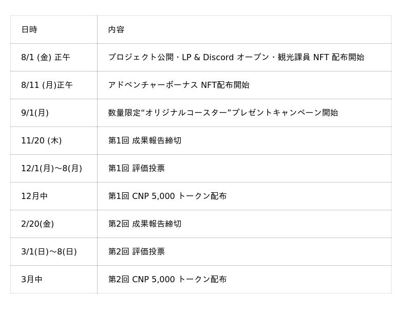 「加西市観光ハックDAO」は、加西市の観光施策を"ハック=再発見・再構築"し、まちづくりに関わる参加型プロジェクトです。オンラインコミュニティ(DAO)に参加し、観光の魅力を発信・提案しながら、人と地域とつながる新しい体験を提供します。活動を通じて、参加者同士で評価投票を行い、貢献度に応じて総額約100万円相当のCNPトークンが配布されます。【『加西市ハックDAO』特設ページからご参加ください。】