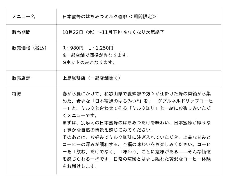 UCCグループで外食事業を担当するユーシーシーフードサービスシステムズ株式会社(本社/神戸市、社長/川野浩司、略称/UFS)は、主力業態の「上島珈琲店」にて、「幻のはちみつ」と呼ばれる、貴重な日本蜜蜂のはちみつをこだわりのミルク珈琲に添えた、今しか味わえない『日本蜜蜂のはちみつミルク珈琲』を、10月22日(水)に期間限定で発売します。