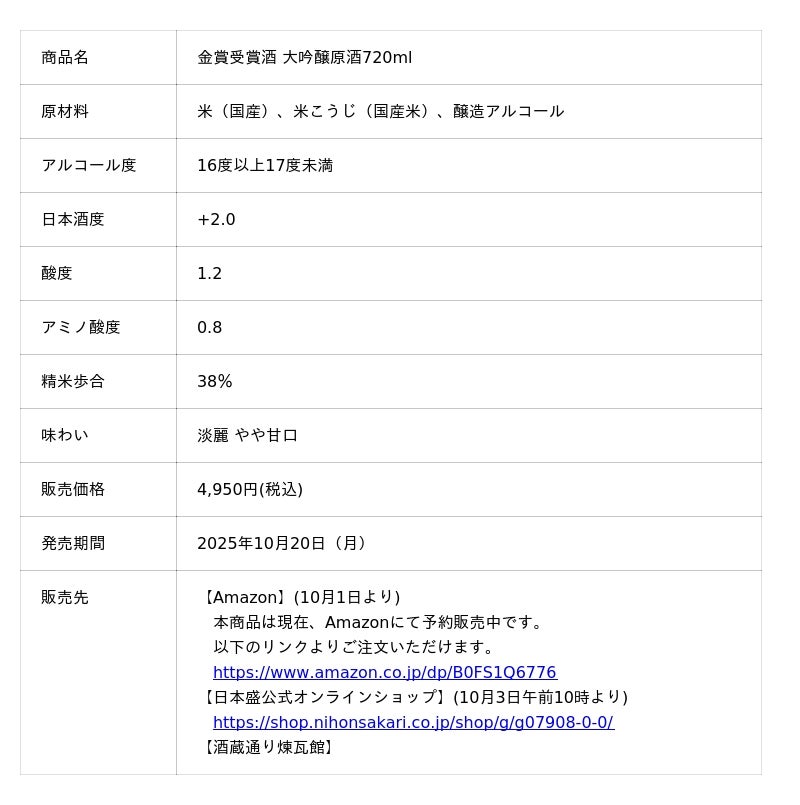 日本盛株式会社(本社:兵庫県西宮市、代表取締役社長:森本太郎)は、令和6酒造年度全国新酒鑑評会で金賞を受賞した日本酒「金賞受賞酒 大吟醸原酒720ml」を2025年10月20日(月)より数量限定で発売いたします。当商品は、兵庫県特A地区・吉川町西奥で育まれた最高峰の山田錦を100%使用し、日本盛の伝統技術に最新の知見を持った杜氏と蔵人が情熱を注ぎこんだ当社の酒造りの真髄を体感できる特別な大吟醸酒です。