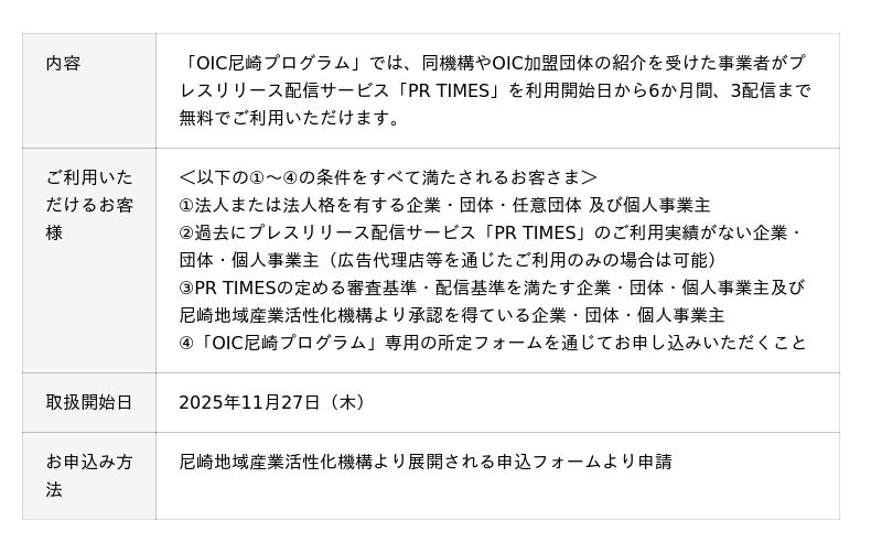 1. 条件を満たした企業への「OIC尼崎プログラム」の提供尼崎地域産業活性化機構が定める条件を満たした企業は、プレスリリース配信を一定条件下で無償とするプログラム(詳細は下記参照)を提供いたします。本プログラムを活用した事業者等がプレスリリースを配信し、まだ見ぬ顧客や協業・コラボレーション先に対して新たな情報接点を創出する支援をおこなってまいります。