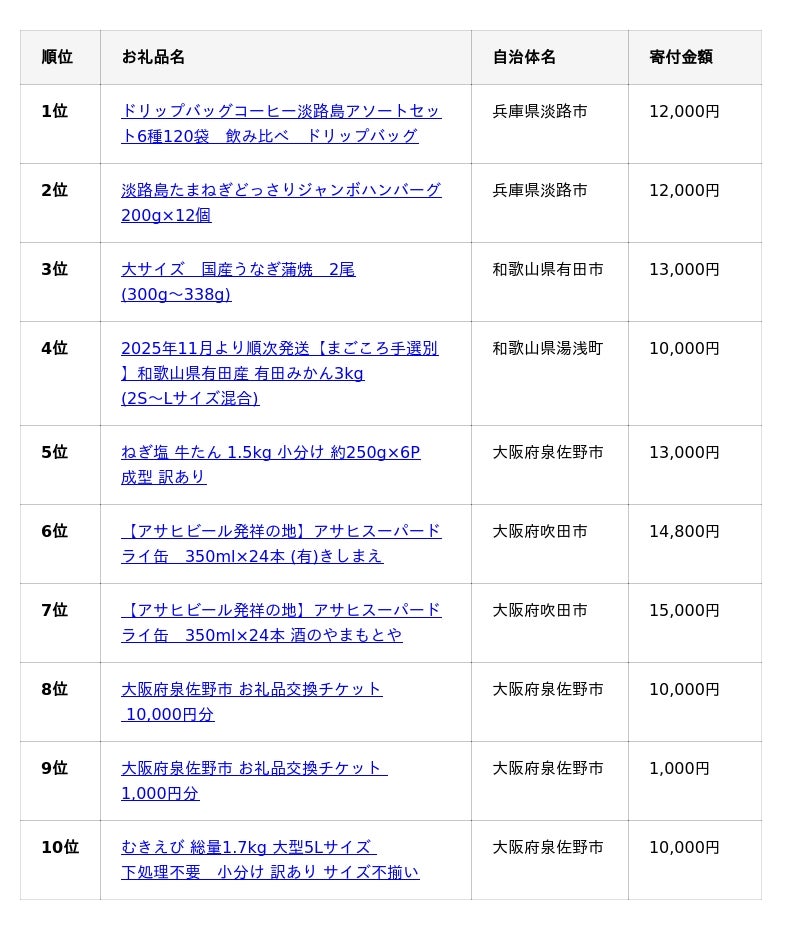 ■<近畿版>2025年ふるさと納税人気お礼品ランキング(速報)
