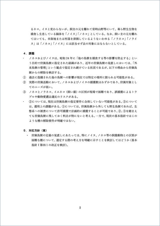 環境省で2025年11月4日(火)に行われた準備会合の議事録に、狩猟鳥獣の対象からノネコ・ノイヌを排除する改正の検討が提案された旨の記述を見つけました。準備会合の議事録の「資料3-3 狩猟鳥獣の選定の考え方の見直しの必要性」の2ページ目にその旨の言及があります。