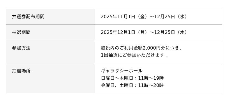 クリスマス期間限定でご宿泊者様はもちろん、施設をご利用いただくすべてのお客様を対象にしたハズレなしの大抽選会を実施いたします。1等には人気の「HERMESスカーフ」をご用意。冬のリゾートステイに、さらに特別な驚きと喜びをプラスする、豪華なプレゼント企画です。