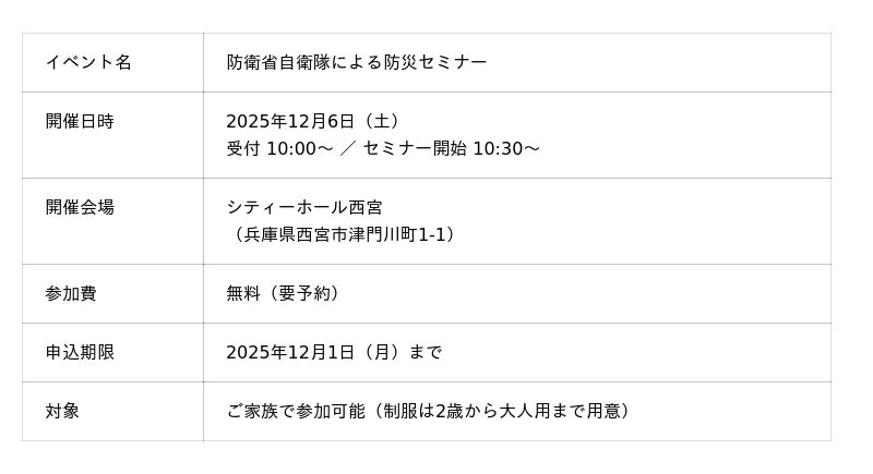 株式会社ベルコ(core中野代理店)は、地域の防災意識向上を目的とした『防衛省自衛隊による防災セミナー』を 2025年12月6日(土) に「シティーホール西宮」(兵庫県西宮市)にて開催いたします。参加費は無料で、事前予約制となっています。