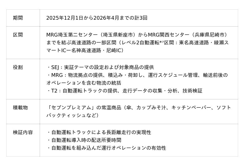 株式会社セブン-イレブン・ジャパン(東京都千代田区、代表取締役社長:阿久津 知洋、以下「SEJ」)、三井物産流通グループ株式会社(東京都港区、代表取締役社長:柴田 幸介:以下「MRG」)および株式会社T2(東京都千代田区、代表取締役CEO:熊部 雅友、以下「T2」)の3社は共同で、コンビニエンスストア・スーパー業界で初めて*¹となる自動運転トラックを用いた長距離輸送の実証を、関東ー関西間の高速道路一部区間で開始します。