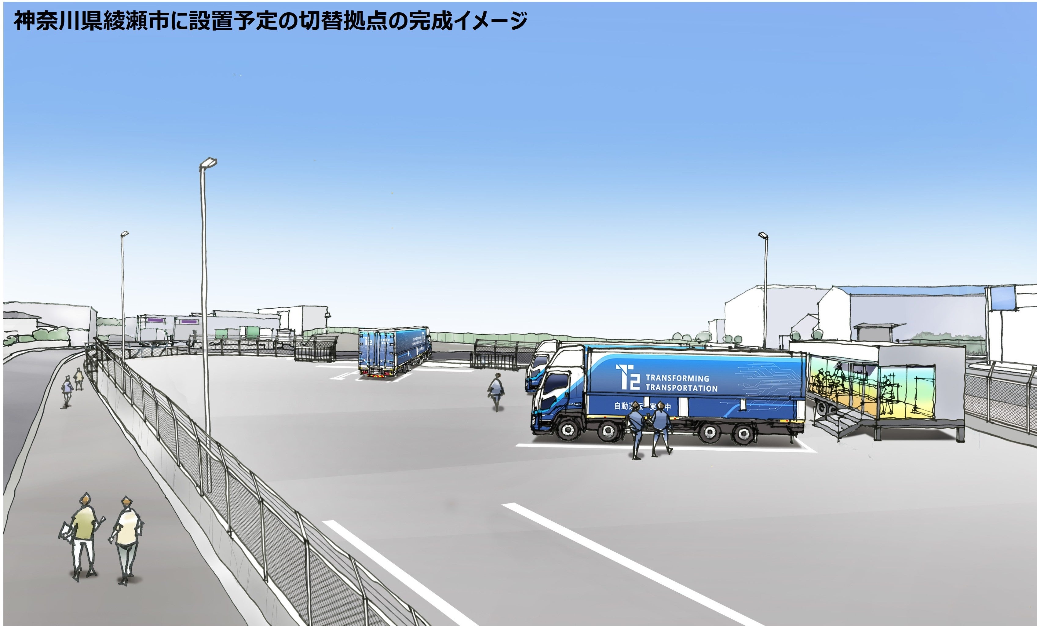 2025年11月に着工し、2026年2月に本拠点の完成を目指します。T2が国内の物流事業者として初めて*⁴設ける予定の神奈川県綾瀬市の「切替拠点」とあわせて、自動運転トラックによる関東ー関西間の幹線輸送体制の確立を図ります。