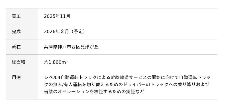 本拠点の設置後には、レベル4自動運転トラックによる幹線輸送サービスの開始に向けて神戸市と連携を強化し、本拠点と神戸西ICの出入口を結ぶ数百メートルの一般道まで自動走行できるよう実証に取り組む予定です。
