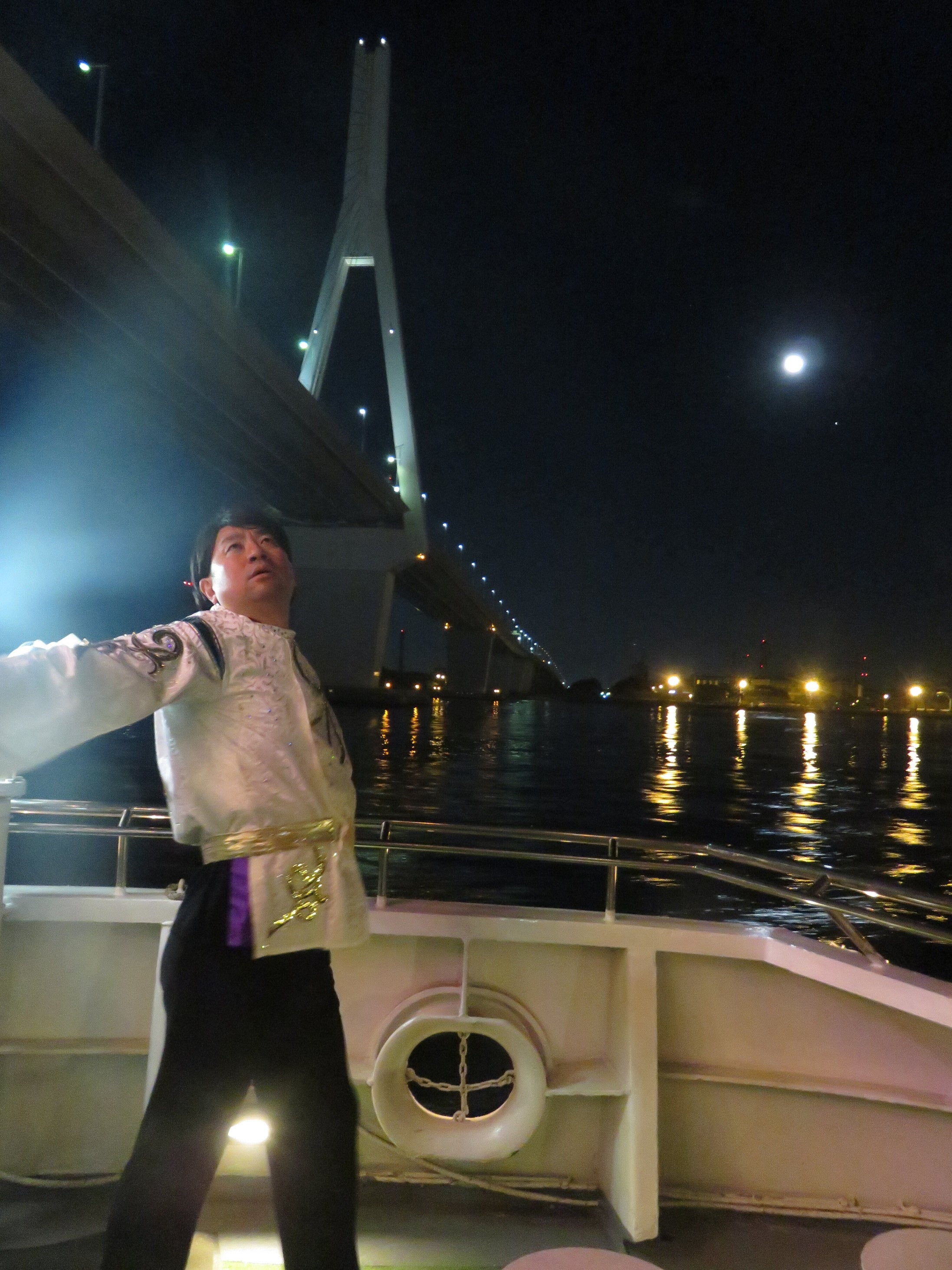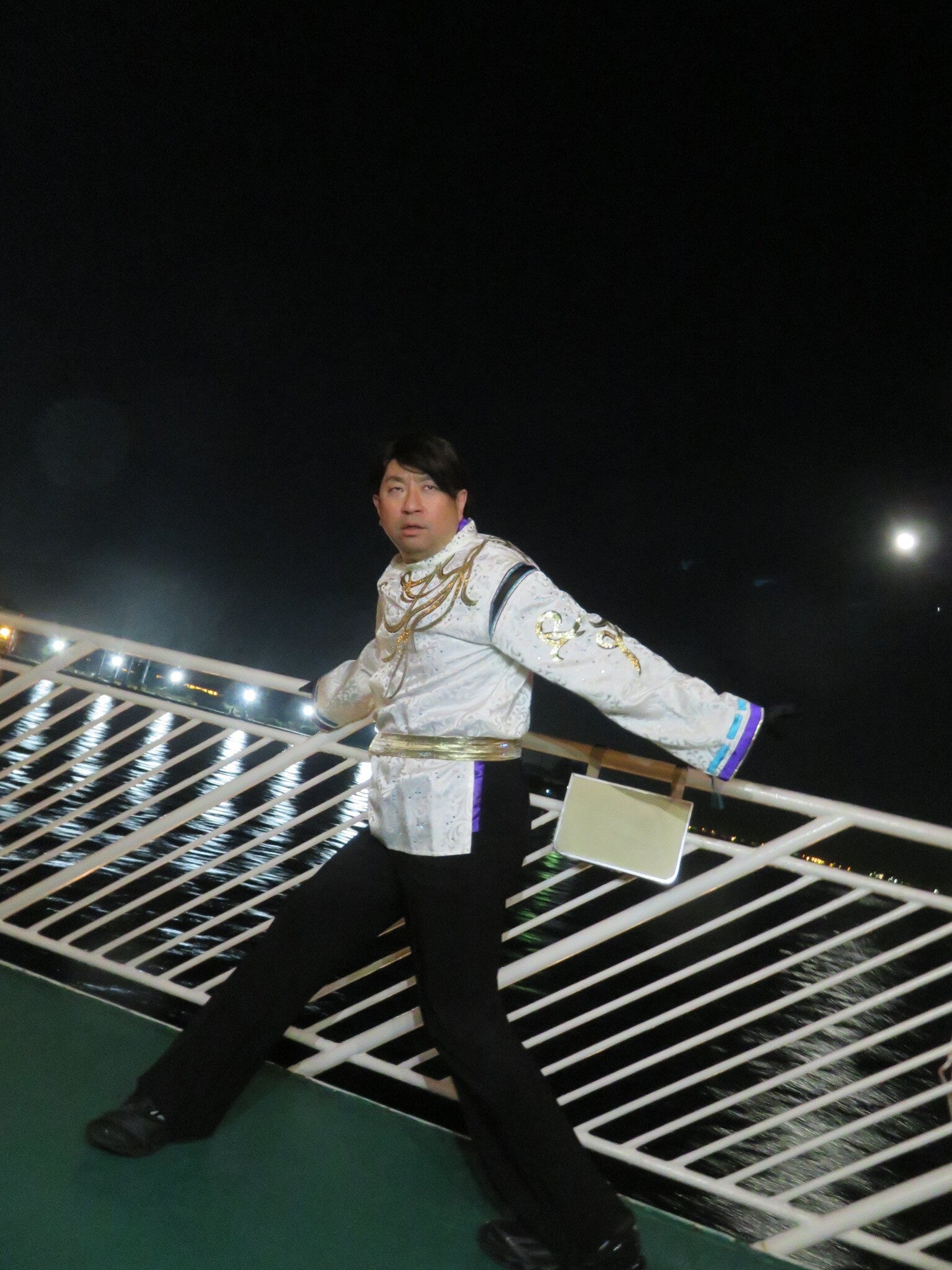 参加者たちはディナークルーズにふさわしくラグジュアリーな装いで乗船。ウェルカムプレゼントの“RGバンダナ”を自身の衣装に合わせてコーディネートし、RGの登場を待ちます。マリーンルージュに欠かせないオープニング曲、サザンオールスターズ『LOVE AFFAIR~秘密のデート』が流れ始めると、姿を現したのは“RG井風”。特徴的なタレ耳とサングラスで察した参加者たちは笑いながら拍手喝采。シャッターを切る手が止まりません。
