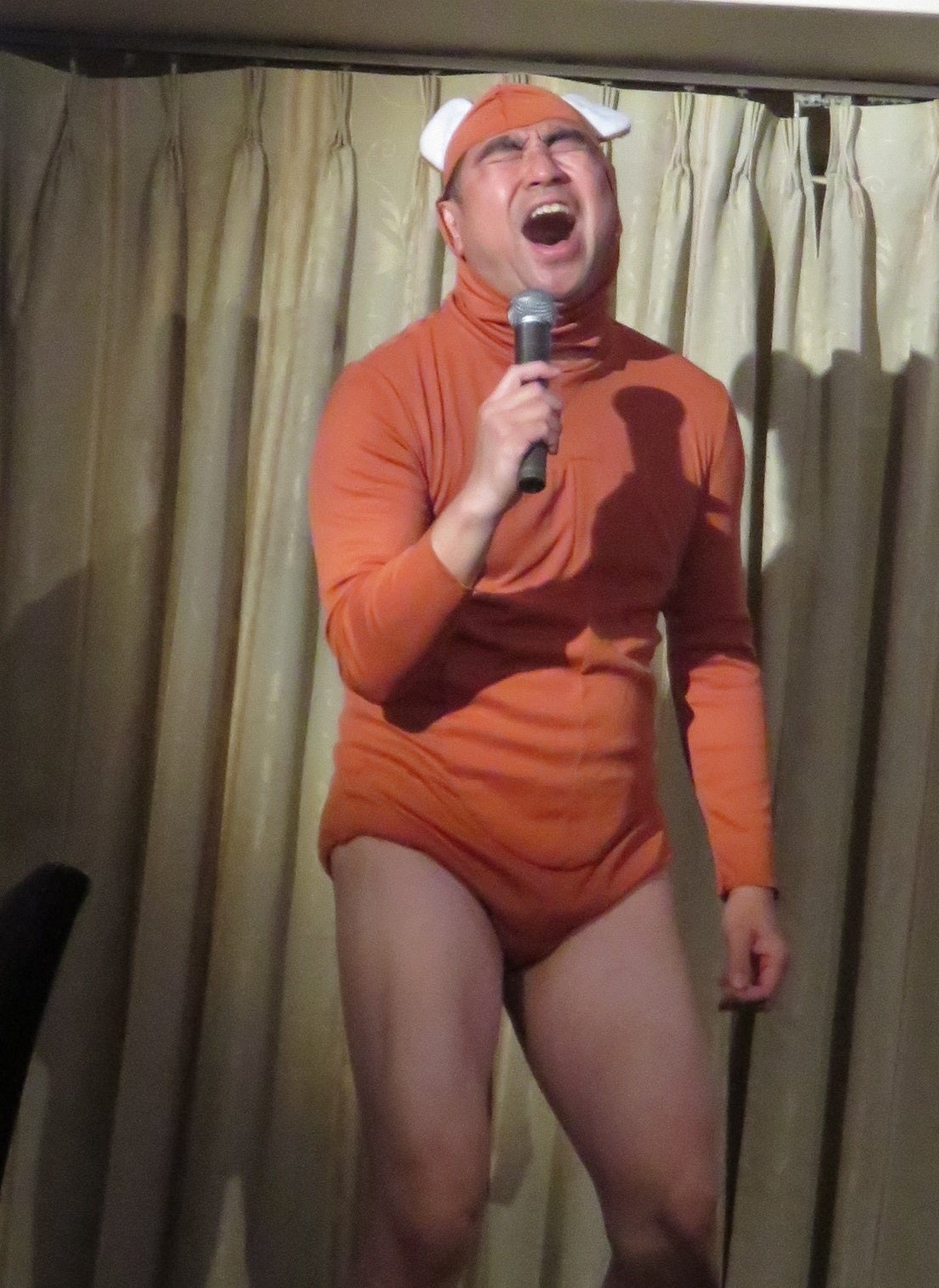 すると、とんでもない歌唱力に船内は大盛り上がり。これまでのRGあるあるツアーでは音響設備のよしあし関係なく自慢のノドを活かしてあるあるを歌いあげてきたRGですが、この日の伸びやかな声には「え、やばい、声が出すぎていた」とビックリしてしまいます。今回第一興商の協力により、DAMのカラオケ音源を使用。その音響の良さに自然とつられたようで、テンションが一気にアップ。参加者が食べていたフルコースディナーの真鯛を見てすぐさま「真鯛あるある」を思いつき、X『紅』をチョイス。「真鯛のあるある shadows on the wall」「真鯛が見えないのか すぐそばにいるのに」と歌うに留まらず、間奏で「ギター 黒鯛! ベース 金目鯛! ドラム 真鯛!」とノリノリ。しかし、歌い上げすぎた結果、あるあるを言う前に曲が終わってしまい、「やべえ、終わった(笑)。あるあるは『大きいやつは黒い』でした」と口上。「気持ちよくなりすぎて歌わないパターン、これRGあるあるでした」とオチをつけました。