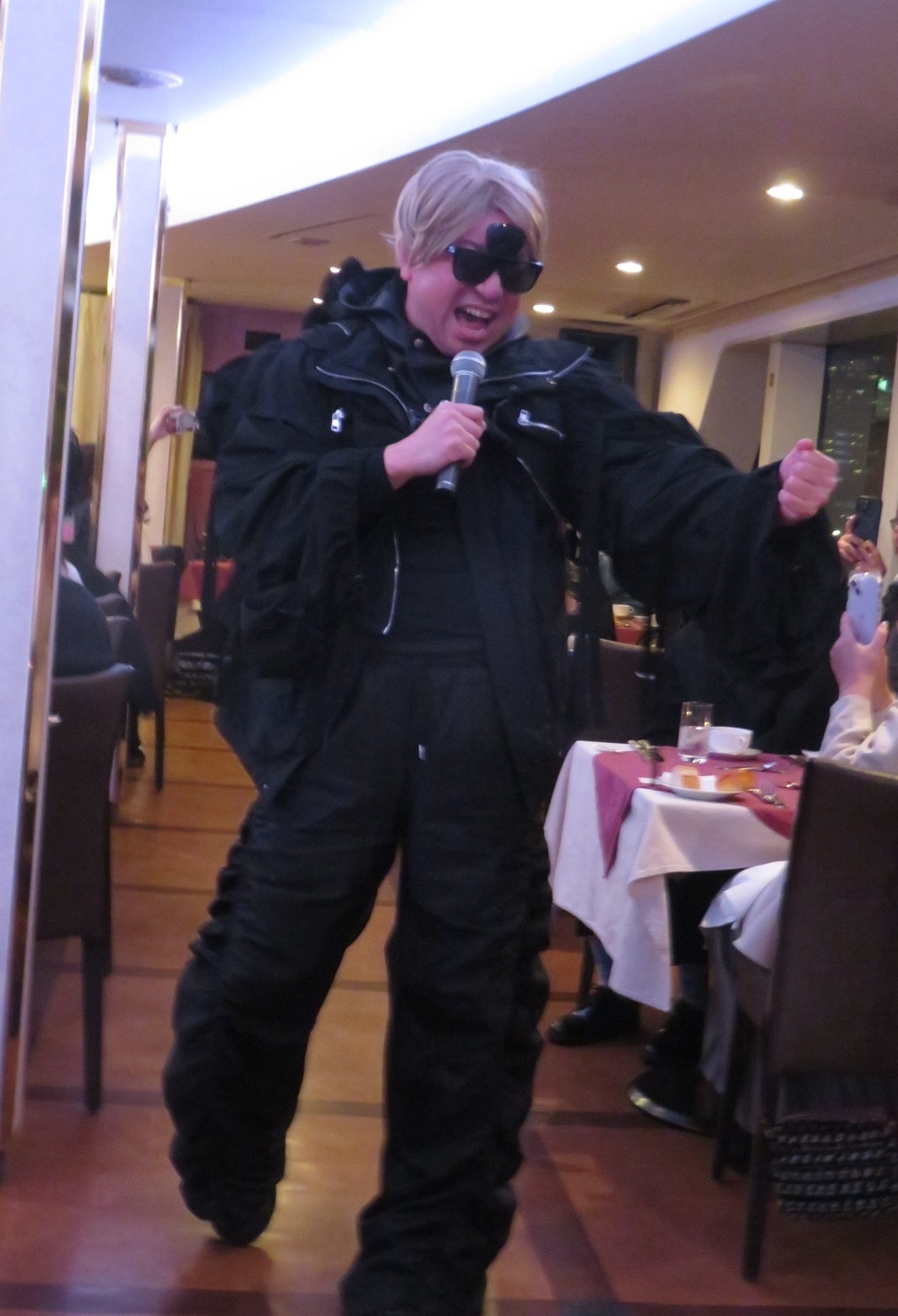 さらにここで、かわうそサンタから、驚異のボディメイクで話題となった見取り図・盛山の女性誌表紙風ブロマイドをサプライズプレゼント。「みんなが知らんところ歌える」とt.A.T.u.『All The Things She Said』のサビ以外も歌ってみせたあと、各テーブルをまわって手渡ししていきました。