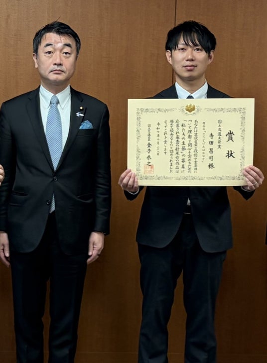応募総数452作品の中から最上位賞の受賞となり、同氏は、令和7年10月28日(火)に開催された表彰式にて、佐々木副大臣より国土交通大臣賞の表彰状を授与されました。