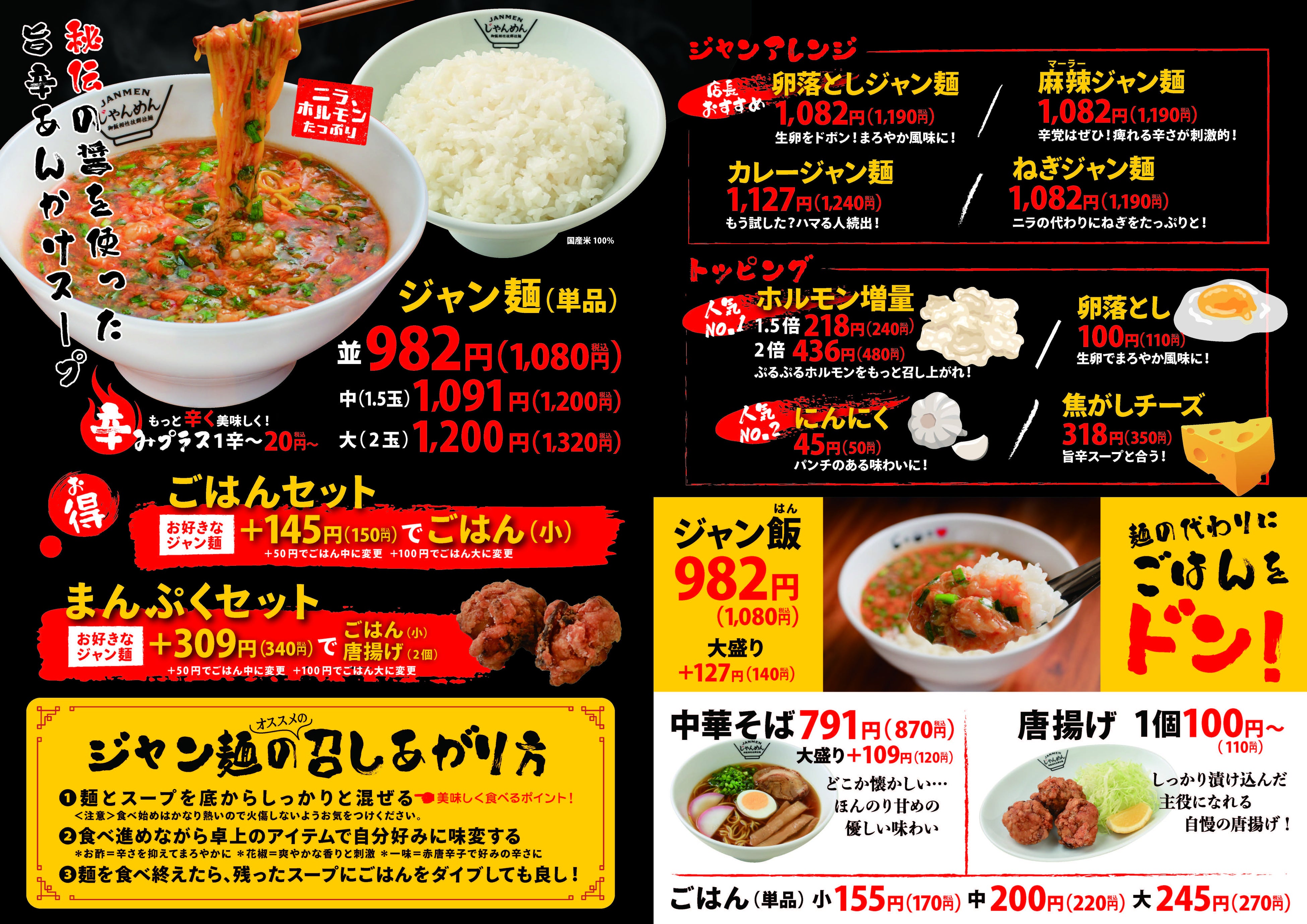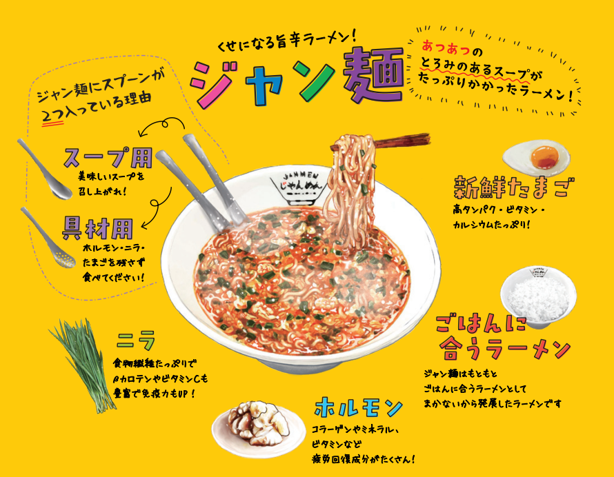 味は少し旨辛でコクがあり、じゃんめんに生卵を落とすことでまろやかな味わいとなり、お子様でも喜んでお召し上がりいただけます。