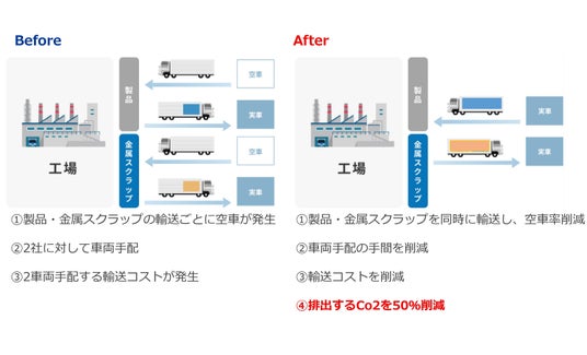 本プロジェクトは、既存トラックの運行に再生資源物の回収(復路)を組み込み、空荷を削減することでCO2排出量を抑制する取り組みです。取り組みの特徴は次の通りです。