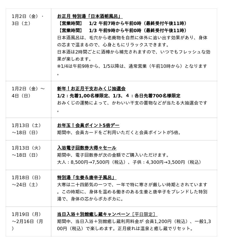 本キャンペーンの目玉は、1月2日(金)・3日(土)限定で実施する、地元・西宮郷の銘酒を惜しみなく使用した「日本酒朝風呂」です。日本有数の酒どころの香りに包まれる贅沢な湯船は、まさに新年の門出にふさわしい“ハレの日”の特別体験。また、1月2日から4日までの3日間は、次回の入浴券など豪華景品が当たる「干支おみくじ」も実施し、新春の運試しをお楽しみいただけます。地下1,001メートルから湧き出る源泉と、地域の伝統が融合した湯の華廊ならではのひととき。心身ともに温まる、健やかな一年の始まりをご提案いたします。
