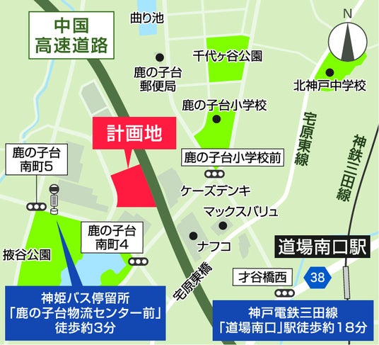 SANKEILOGIブランドとして兵庫県初進出となる本物件は、神戸電鉄三田線「道場南口駅」から徒歩圏、JR三田駅からもバス便(約14分)があるなど通勤利便性が高い立地で、周辺では物流倉庫や神戸三田プレミアムアウトレットなど、雇用事例も多数あるエリアです。