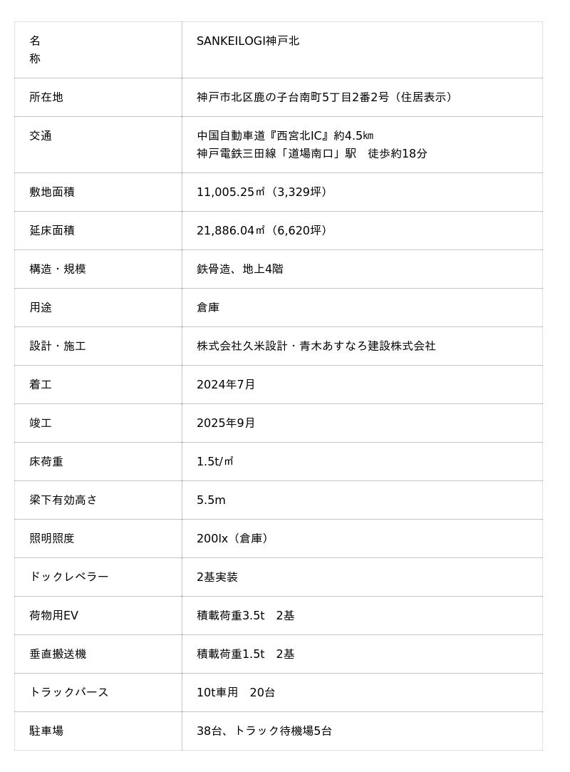 株式会社サンケイビル(本社:東京都千代田区大手町、代表取締役社長:飯島 一暢、以下「当社」という)は、開発を進めていた物流施設「SANKEILOGI神戸北」(所在地:神戸市北区鹿の子台、以下「本物件」という)が竣工しましたのでお知らせいたします。