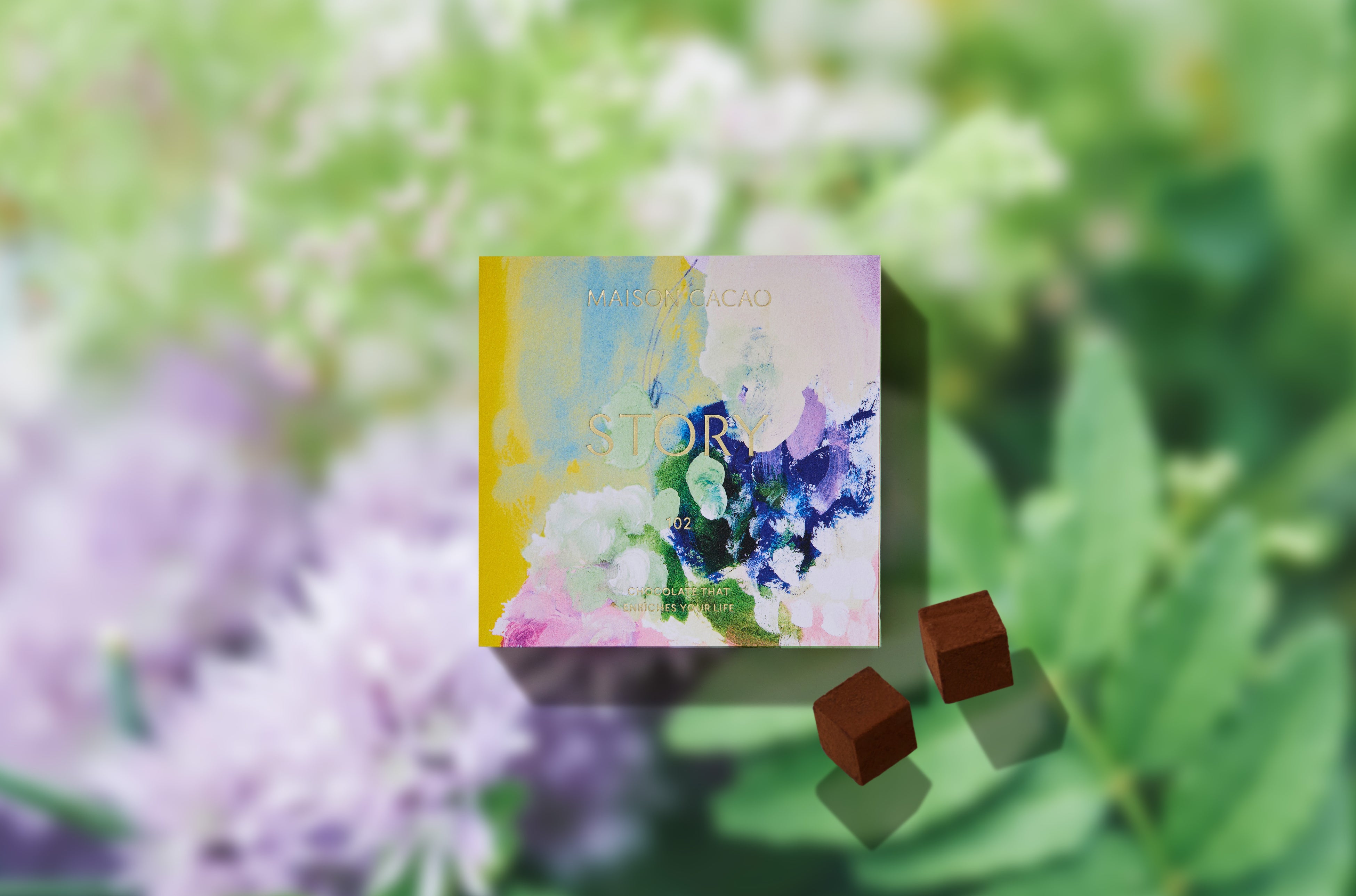 幻想的なアートボックスの中には、ロイヤルミルクティーのヴィーガンチョコレートを詰めました。和三盆を合わせることで紅茶の柔らかな香りが引き立ち、華やかさとカカオ感が奥深いビターチョコレートと調和します。