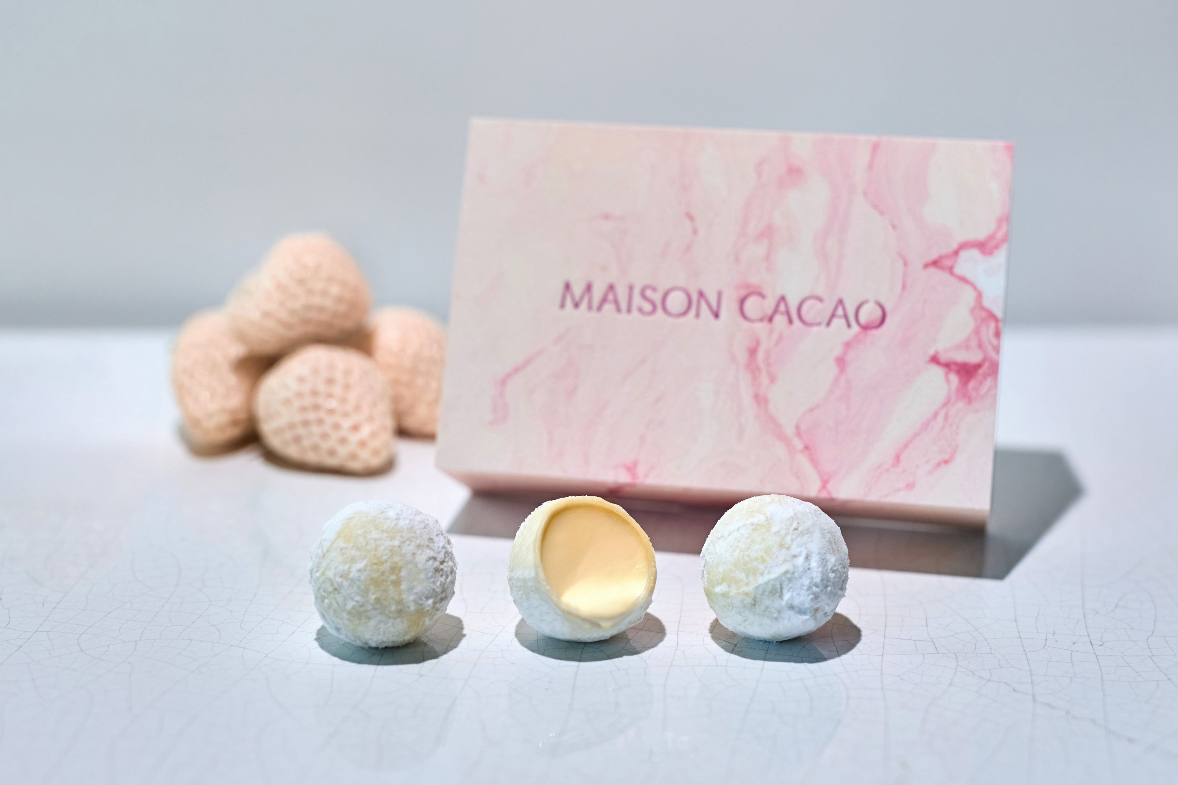 薄く繊細なチョコレートの殻を割ると、その内側から果実の香りと生クリームの軽やかな甘みがあふれ出す、まるで果実をそのまま味わうようなみずみずしく贅沢な一口です。チョコレートと果実が溶け合う瞬間、素材が持つ季節感が華やかに広がり、ひと口で旬を旅するような体験へと。メゾンカカオが辿り着いた、果実とショコラの新たな表現です。あまおう、パイナップル、ル・レクチェ・リンゴの4種が登場!