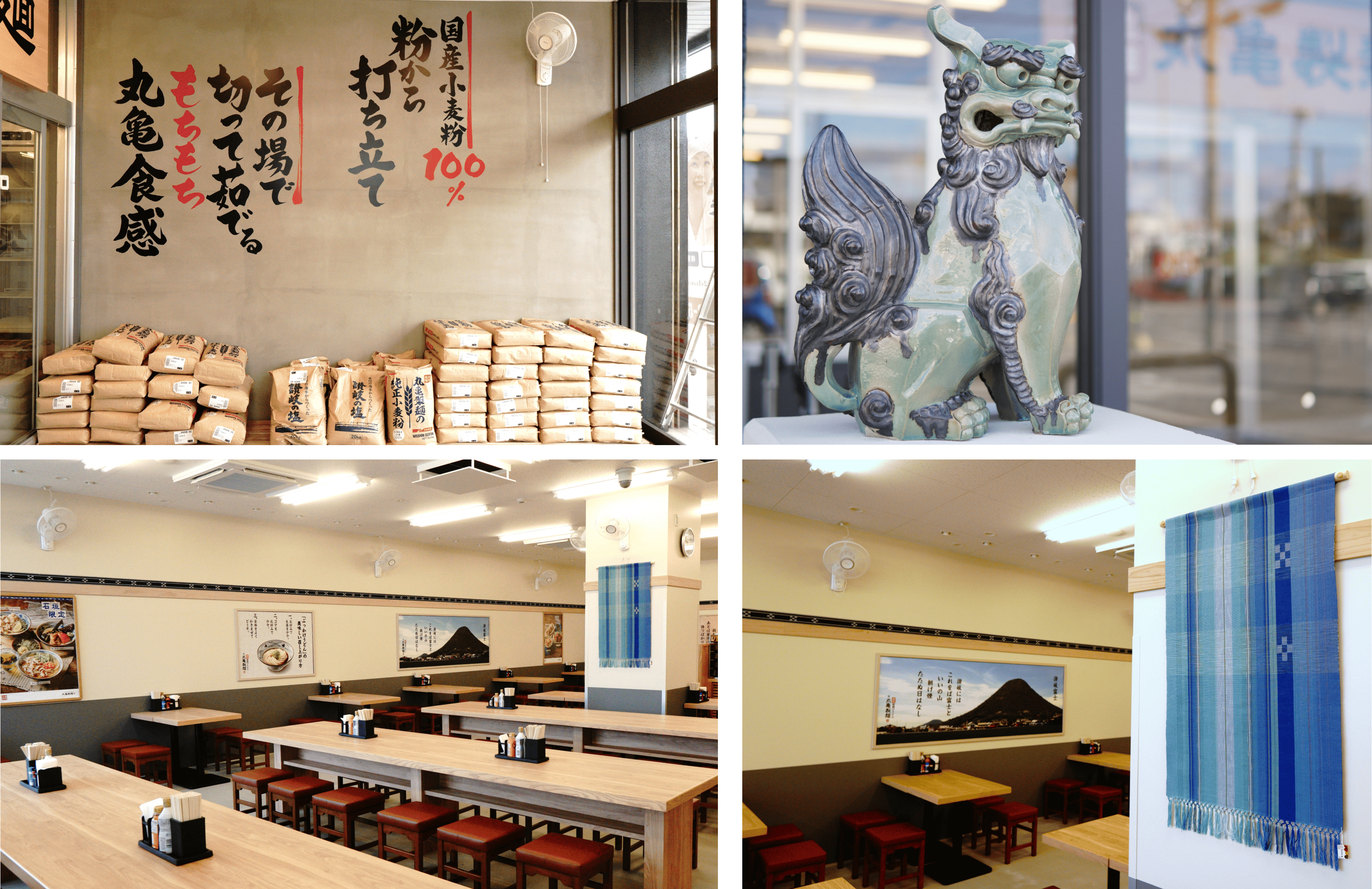 石垣島店は、製麺所ならではの風情感を残しつつも、この土地ならではの文化を取り入れました。まずは、入り口では1対のシーサーがお出迎え。そこから中に入ると、厨房で職人が粉からうどんを打ち、切って、茹でるといった一連の製麺や手づくりの調理を行う厨房が目の前に広がります。客席には、地元の織職人がこのために制作した手織りの22メートルにも及ぶ石垣島の伝統織物「八重山ミンサー織り」が壁に飾られています。他にも、「八重山ミンサー織り」のタペストリーや民芸品を展示しています。