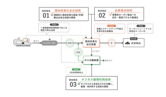 本実証では、一般廃棄物の処理に伴い排出される二酸化炭素(CO2)を分離・回収して固体炭素を製造するとともに、カーボンニュートラルな導電性カーボン材として製品化する技術の開発に取り組みます。実施期間は2025年11月から2028年3月までを予定し、脱炭素社会の実現に向け2030年度の社会実装を目指します。