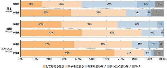 <図1:チームワークに関する自己効力感 キッザニア来場前・後の比較(国別)> (C) KCJ GROUP