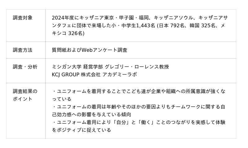 こども達がキッザニアでユニフォームを着ると、真剣な表情や嬉しそうな笑顔になることがあり、本研究ではこれを「ユニフォーム・マジック」と名付けて調査を行いました。共同研究者はミシガン大学 経営学部 グレゴリー・ローレンス教授で、ユニフォームの着用が、こども達のチームワークに関する自己効力感に、肯定的な影響を与えていることが明らかになりました。